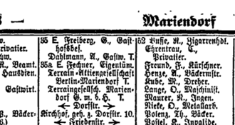 | Berliner Adressbuch von 1906. Freiberg wird nicht für die Adresse "Chausseestraße 53" (dem heutigen Kindergarten) als Gasthofbesitzer benannt, sondern auch für das Gebäude "Chausseestraße 35 (zeitweilig 34)", in welchem "A. Dahlmann" als Gastwirt tätig ist.